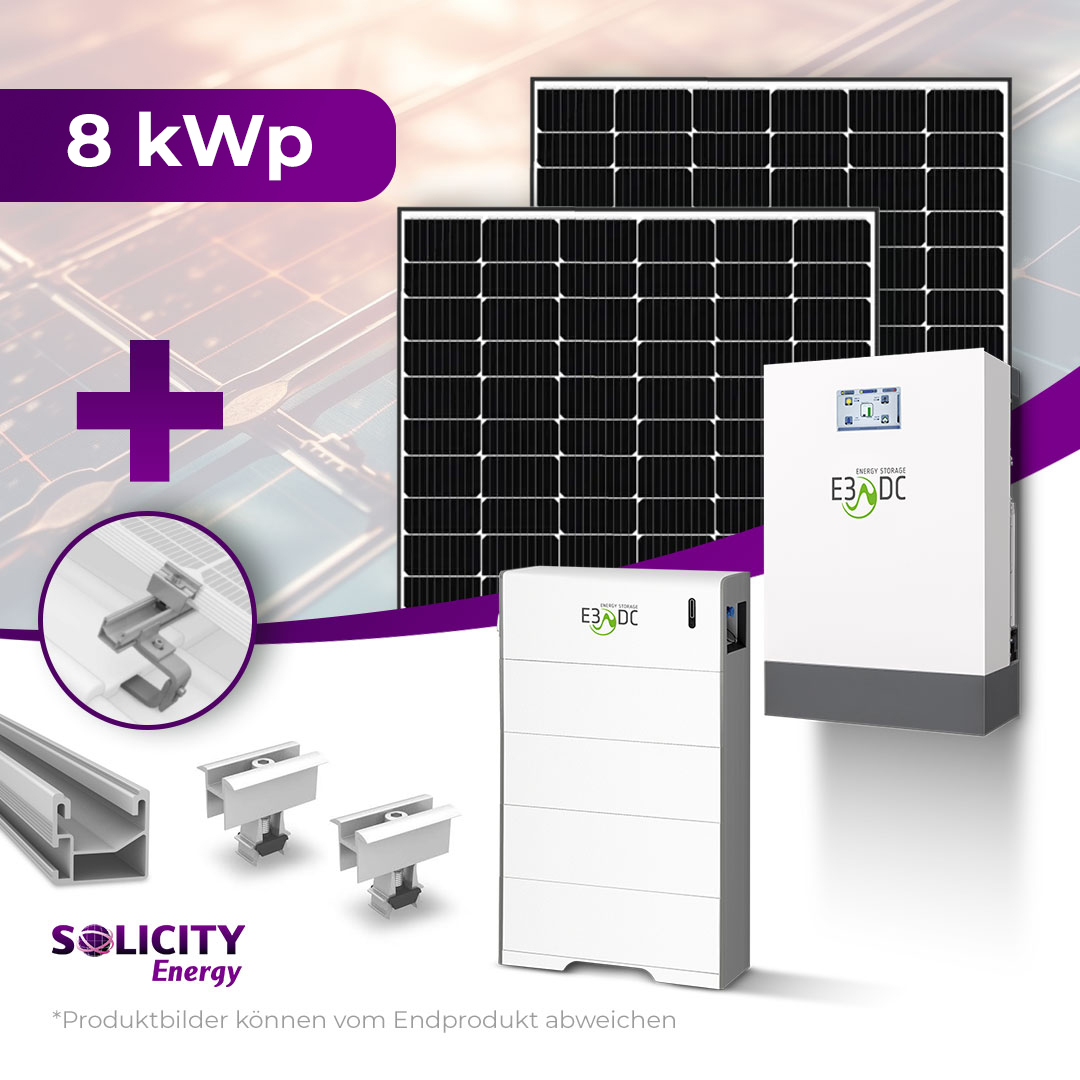 Das Komplettpaket 8 kWp beinhaltet Trina Vertex S+ 455 Wp Solarmodule, das E3/DC S10 X Hauskraftwerk 14 (Compact, schwarz) sowie einen Notstromschalter. Die Unterkonstruktion wird vollständig von Würth geliefert.